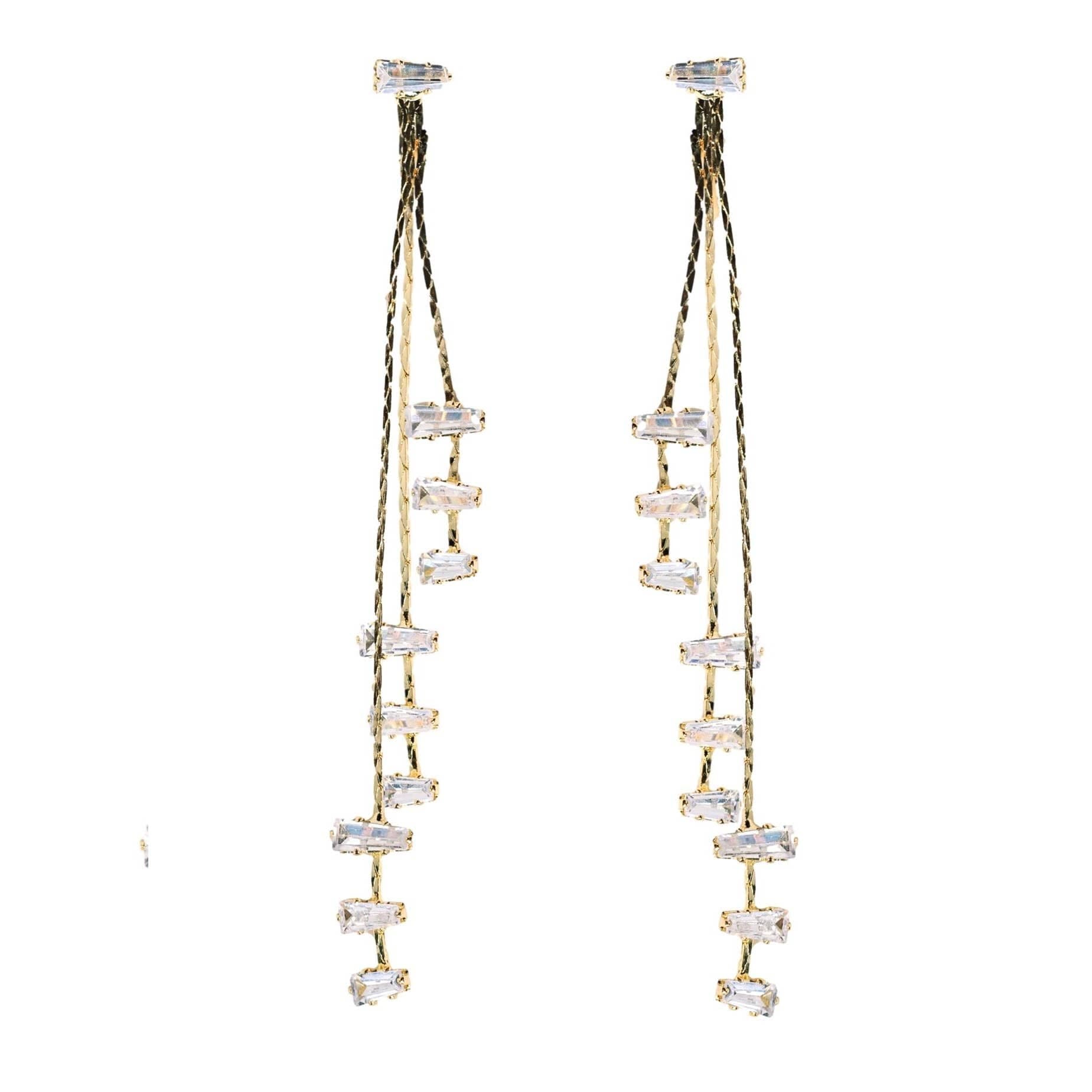 Add an elegant touch to your holiday ensemble with these stunning skinny gold and diamond tassel earrings. Designed to elevate your style, these earrings feature delicate gold chains that gracefully cascade and catch the light, making them a perfect accessory for festive occasions and glamorous celebrations like New Year's Eve. -3" Drop -Lightweight -Gold Hardware