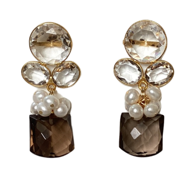 Crystal Earring Post , Freshwater Pearl Cascades, Smokey Quartz Gemstone Drop