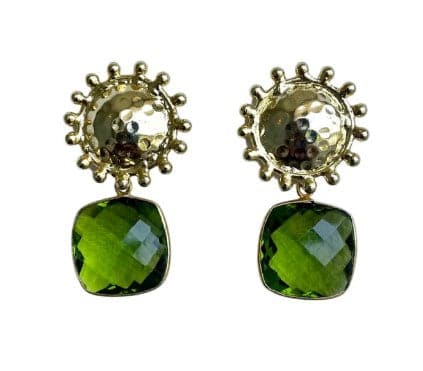 New! Hammered Gold earring post with cushion cut Peridot gemstone dangle. Lightweight. Measures approximately 1 inch.