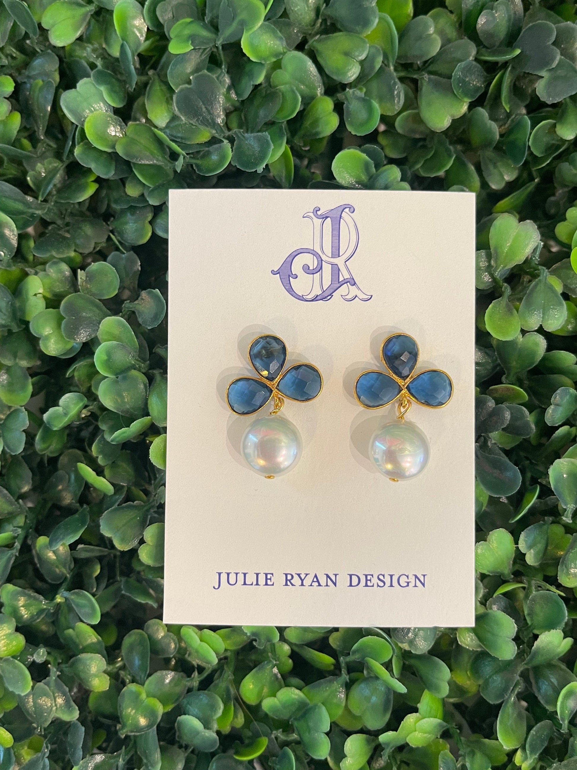 Topaz Fleur Stud with Mother of pearl coin pearl dangle. Gorgeous blue and white combination. Lightweight