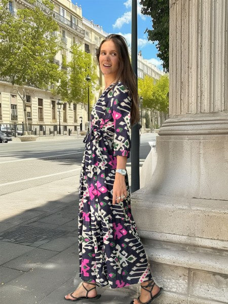 Long wrap dress with navy ikat print in pink, green and white. V-neckline, long sleeves, matching fabric belt. Slightly flared hem and structured skirt. Soft viscose-cotton blend.