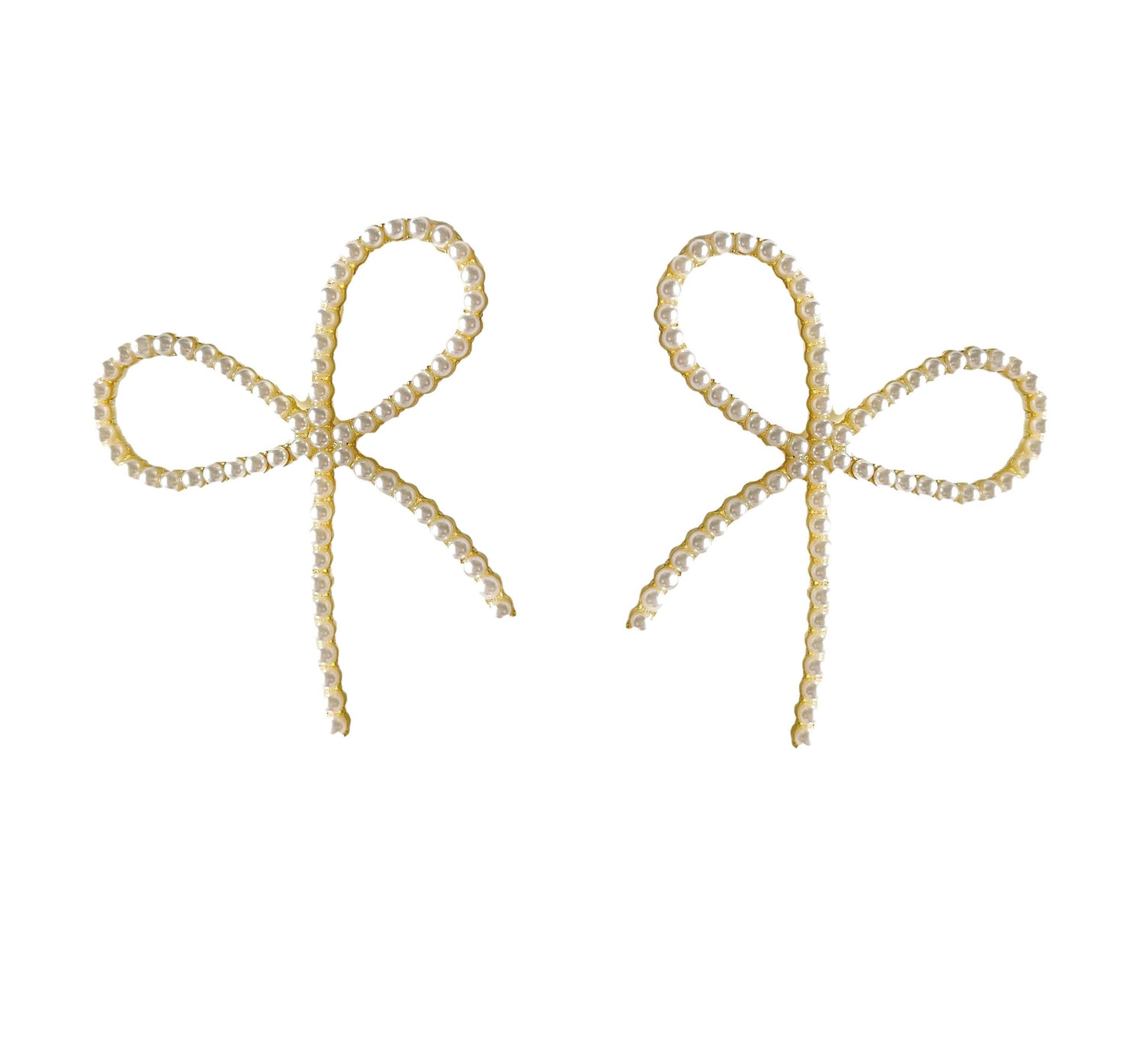 Super festive and elegant! Our pearl statement bows perfectly pair with tartan or velvet for the holidays and florals for springtime! These beauties are approximately 2.5 inches long and post back.