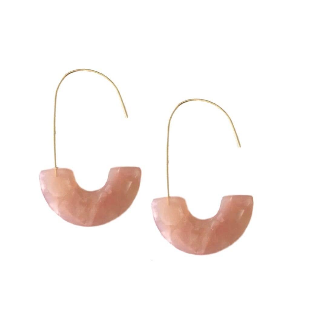 These earrings feature a half moon shaped resin tortoise shell mold affixed with an ultra long "thread through" post. 2.2 inches long and 1.5 inches wide (half moon bead - end to end). "Slip on" thread style hoop earring with an ultra long post and pink resin "half moon" bead.