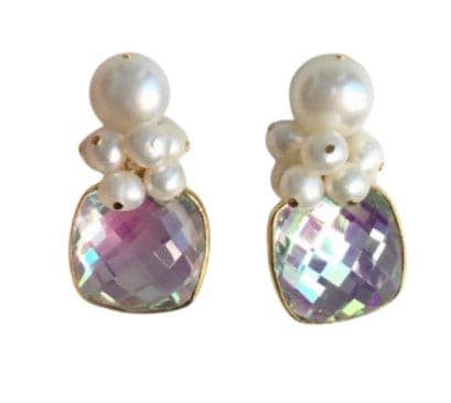 Freshwater earring post with freshwater pearl cascades. Doublet gemstone drop.