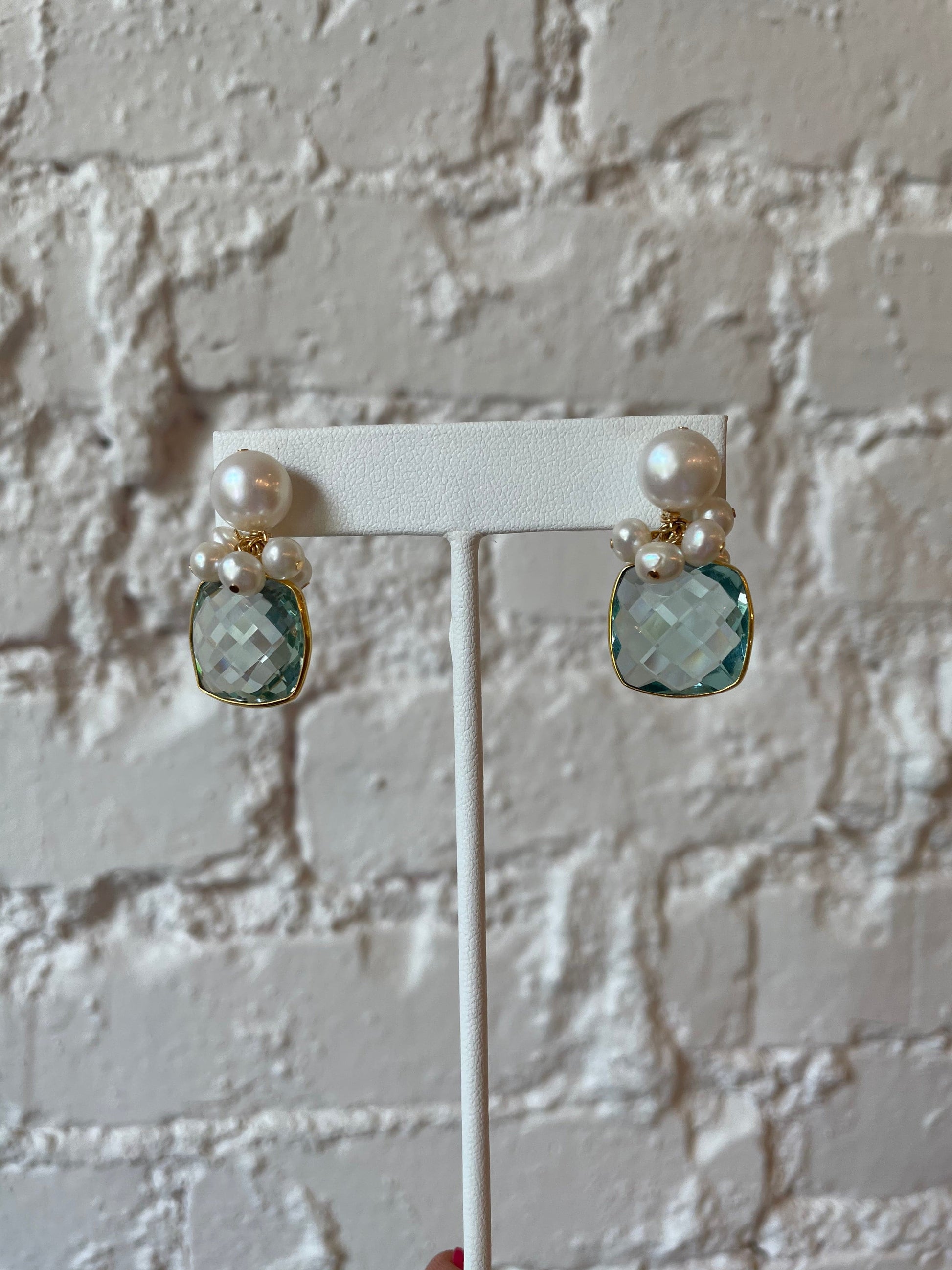 Freshwater pearl stud with freshwater pearls cascades, aqua quartz bezel.