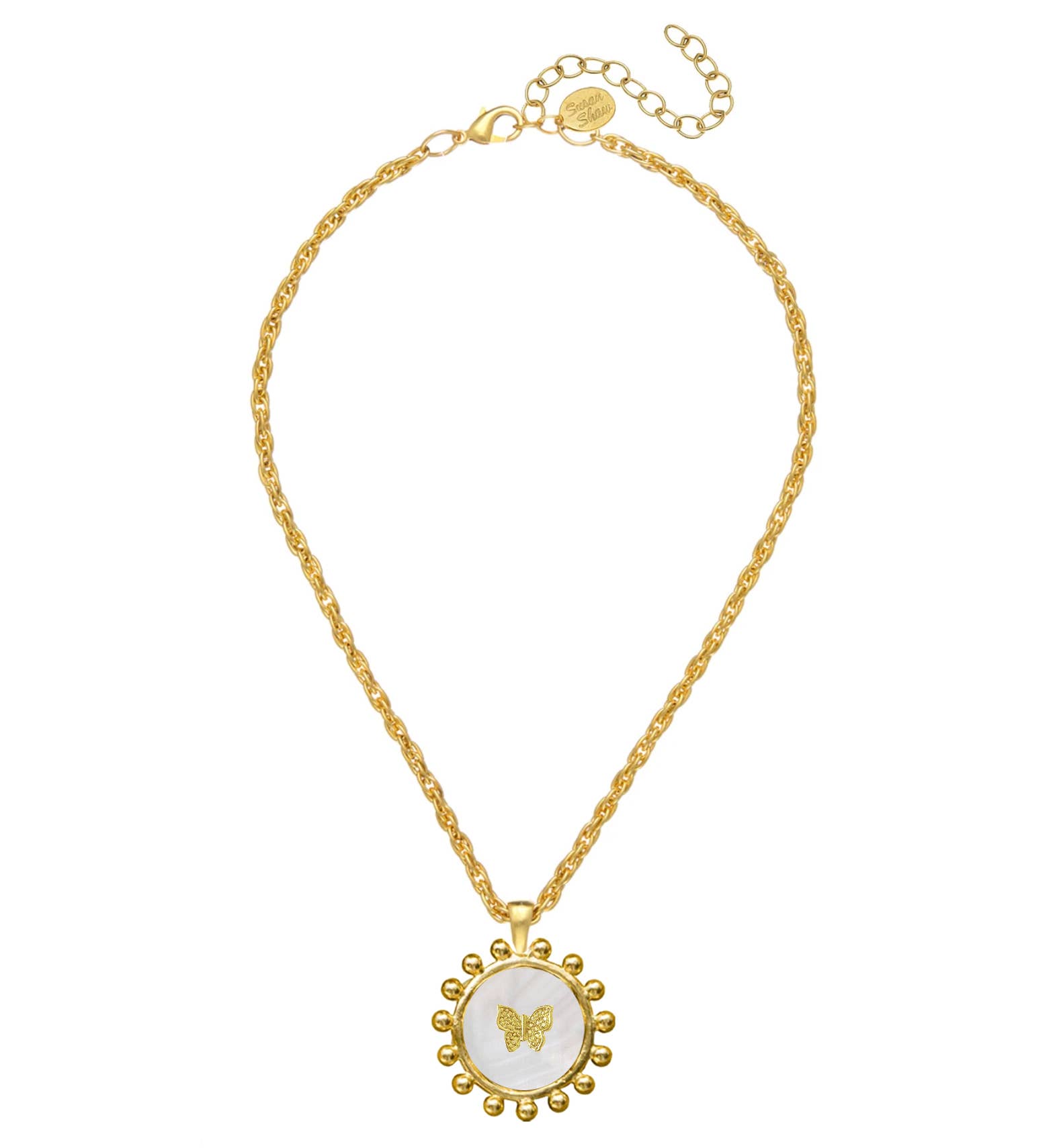 Featuring a glistening Mother of Pearl pendant adorned with a gold butterfly on a solid rope chain, the Sophie Butterfly Necklace is beautiful layered or on its own. Symbolizing hope and freedom, the butterfly is the perfect playful symbol for spring or summer.