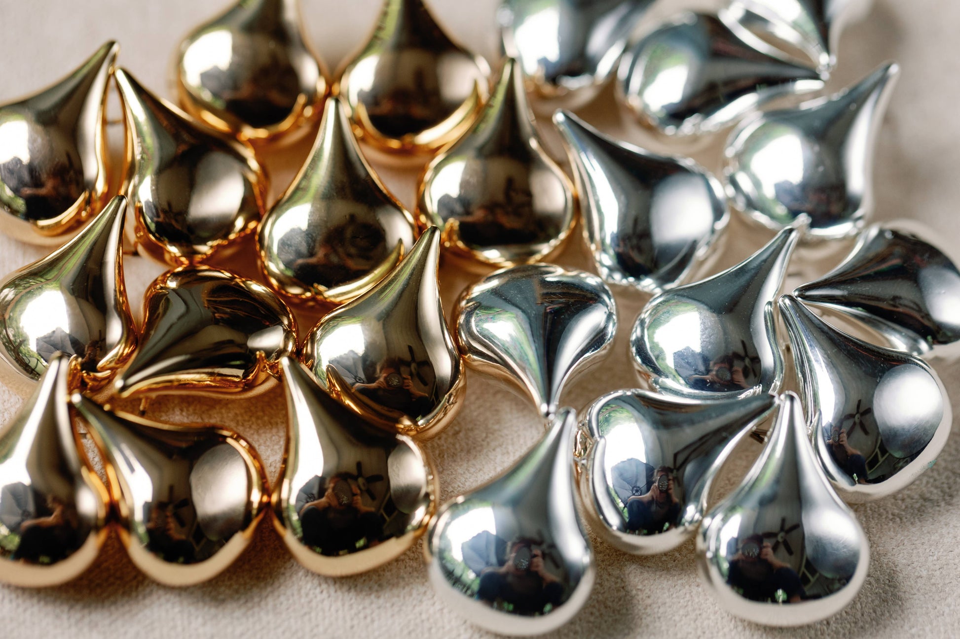 Our new chunky teardrop earrings in silver-plated brass feature a chunky base with an elongated center, adding a touch of on-trend sophistication to any outfit. Their polished finish and bold design, perfectly sized a 1”, make them a great basic for all seasons.